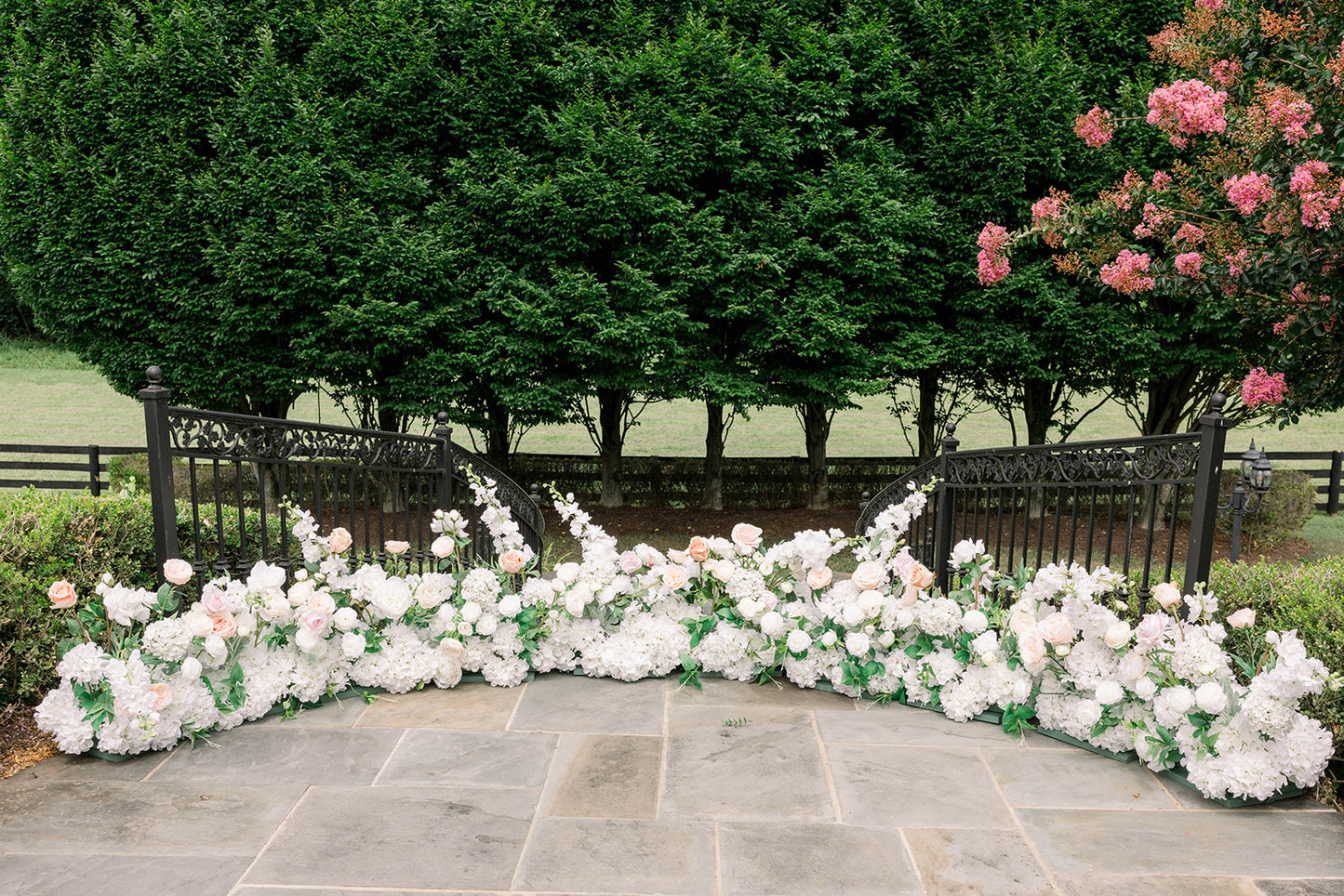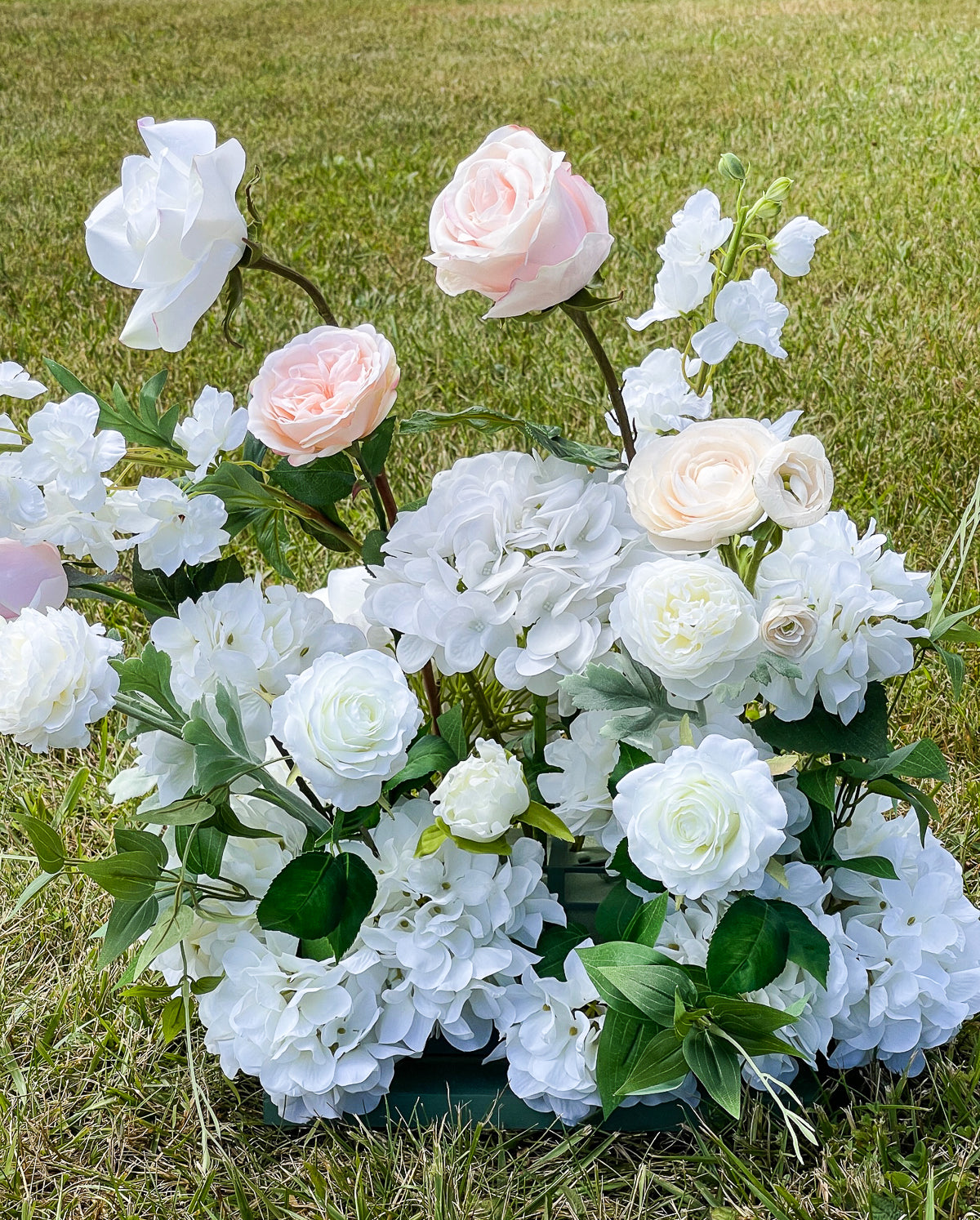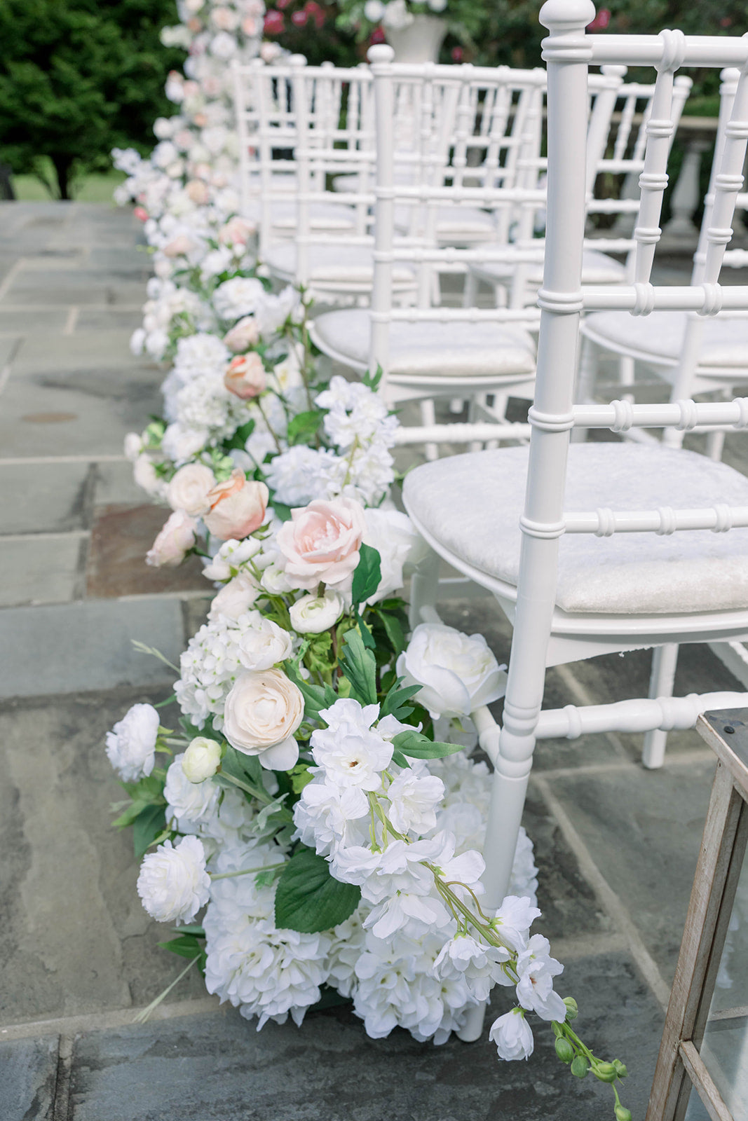 The Avery Aisle Flowers have the option to include fresh flowers*, coupled with real touch fine silk flowers. Our Aisle Flowers are stunning, these arrangements contain beautiful soft white garden roses, soft cream peonies, white garden rosebuds, white playa blanca roses, pale peach ranunculus, ivory hydrangeas, white ranunculus, and white delphinium, with touches of floating clematis. The design is a fine art garden style.