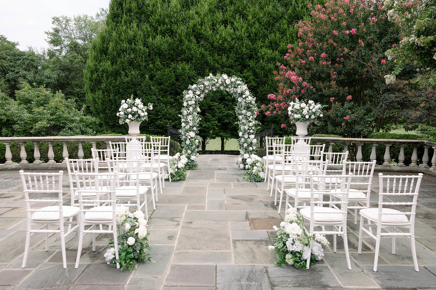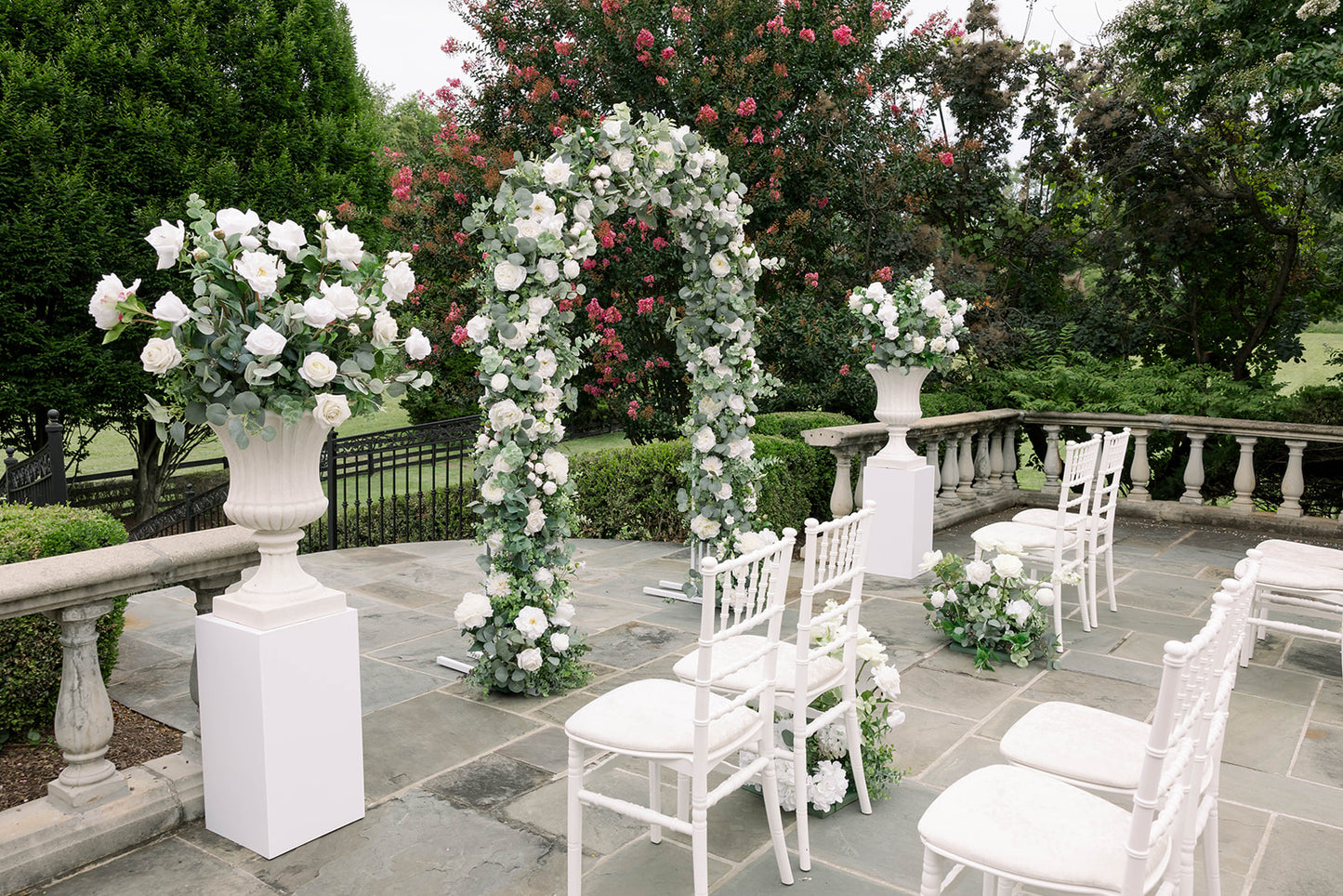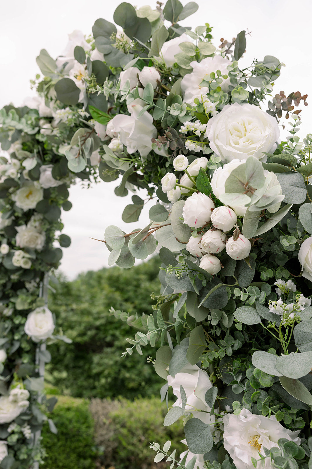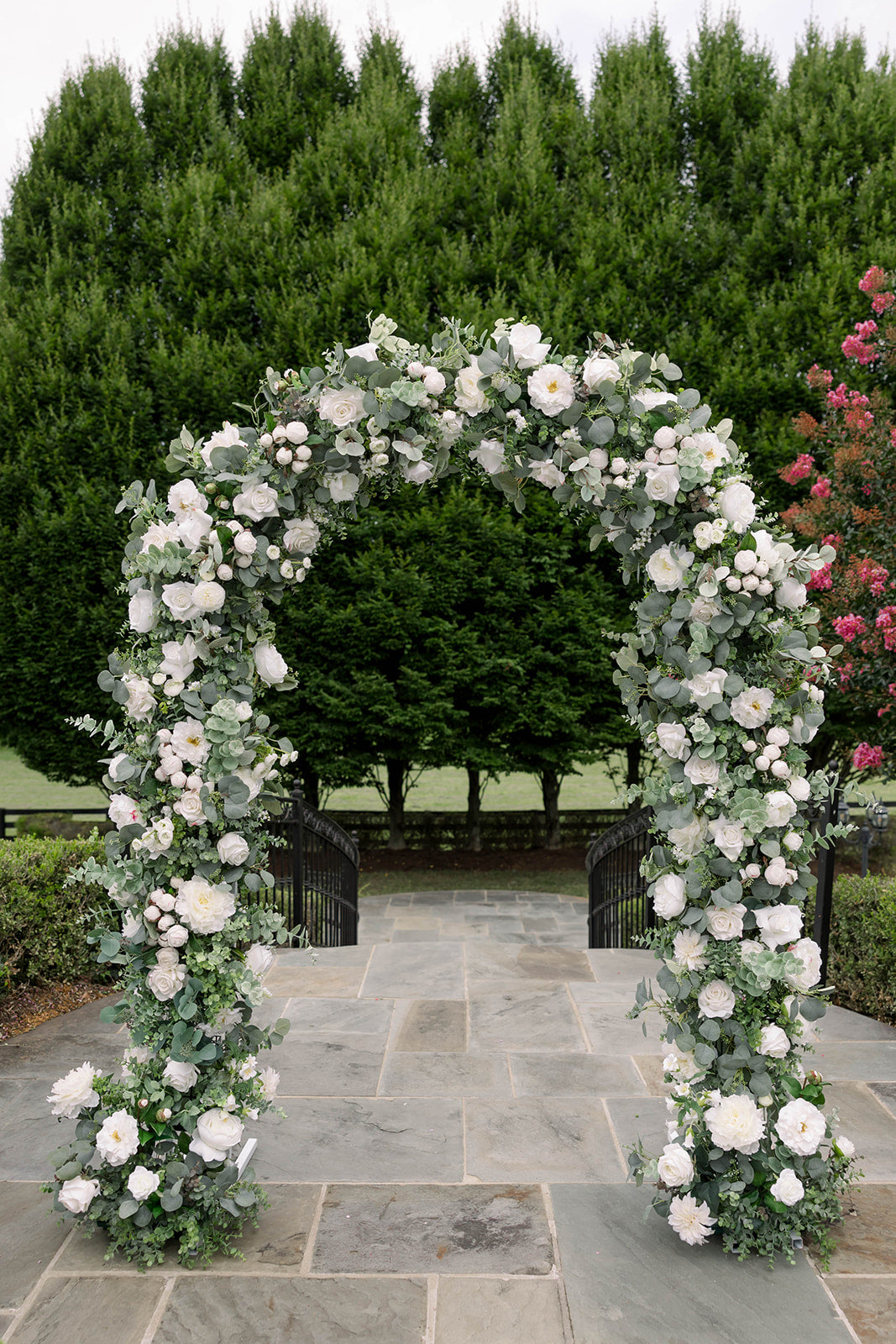 The Camille Floral Arbor makes a statement at any event. Measuring approximately 7 feet high by 5 feet wide and completely covered in luxury silk real-touch florals.