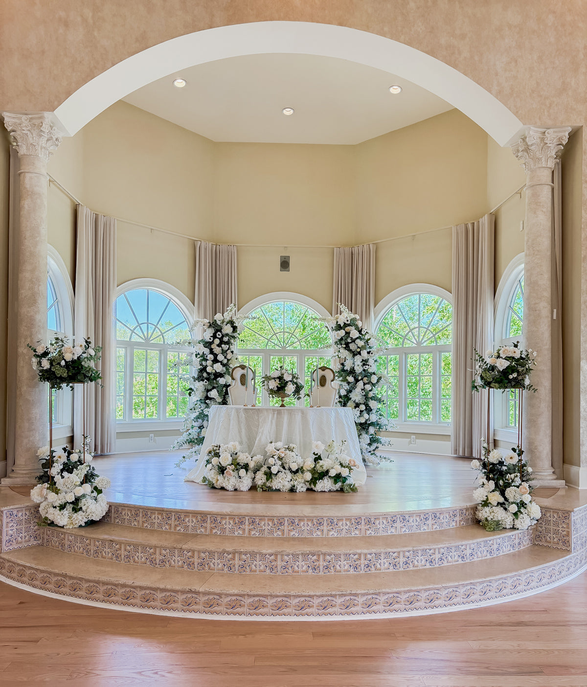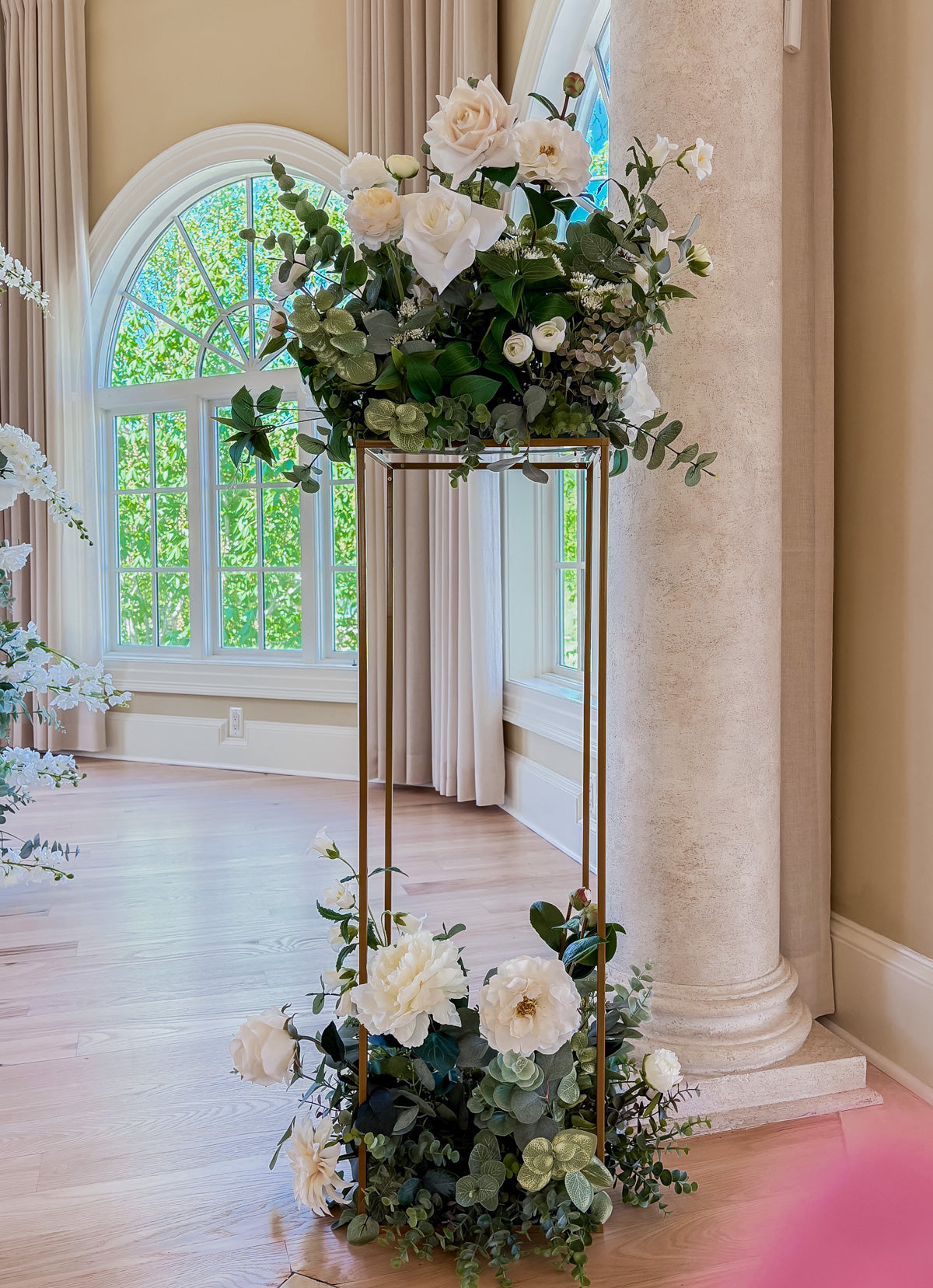 Coordinating with our Ivory Garden Collection, we offer tiered display arrangements perfect for your ceremony, or next to your sweetheart table. We suggest pairing these with several of our aisle florals for a wonderful display (the base floral shown).